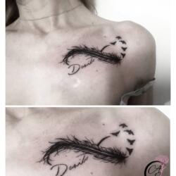 Otro diseño que se ha vuelto muy común con la idea de las plumas es el del símbolo de infinito, el cual en una de sus líneas llevará una pluma que puede adornarse con distintos elementos como las aves.