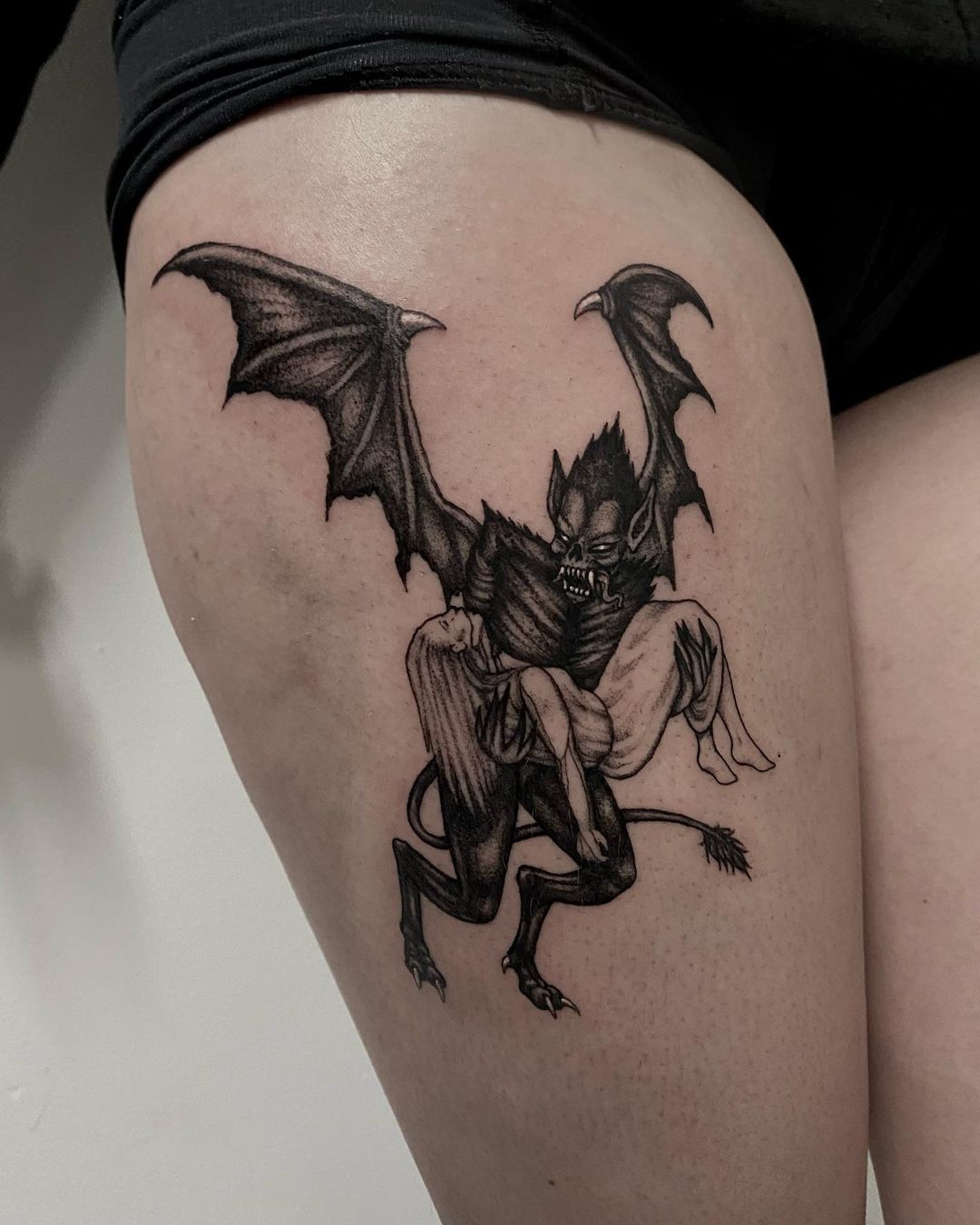 En la sociedad, el demonio es el que y muestra toda la maldad humana. Un demonio es sinónimo de mal para muchos. Los demonios tienen una gran connotación religiosa ya que es uno de los temas más comunes en los tatuajes cuando alguien quiere marcar imágenes oscuras o sombrías en su piel.