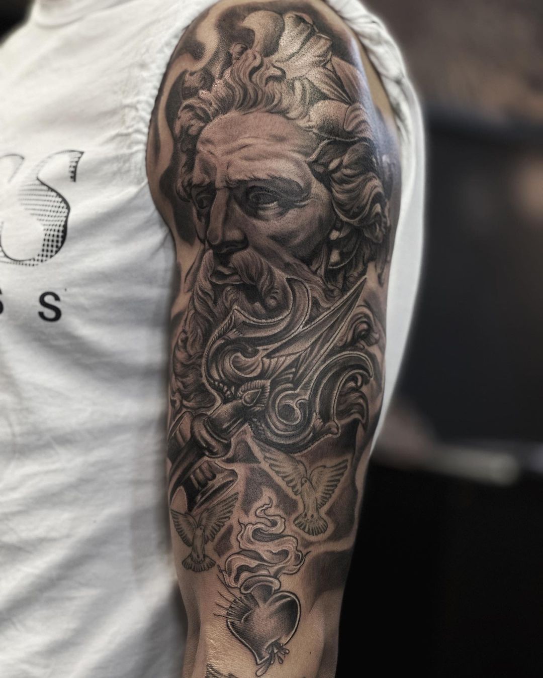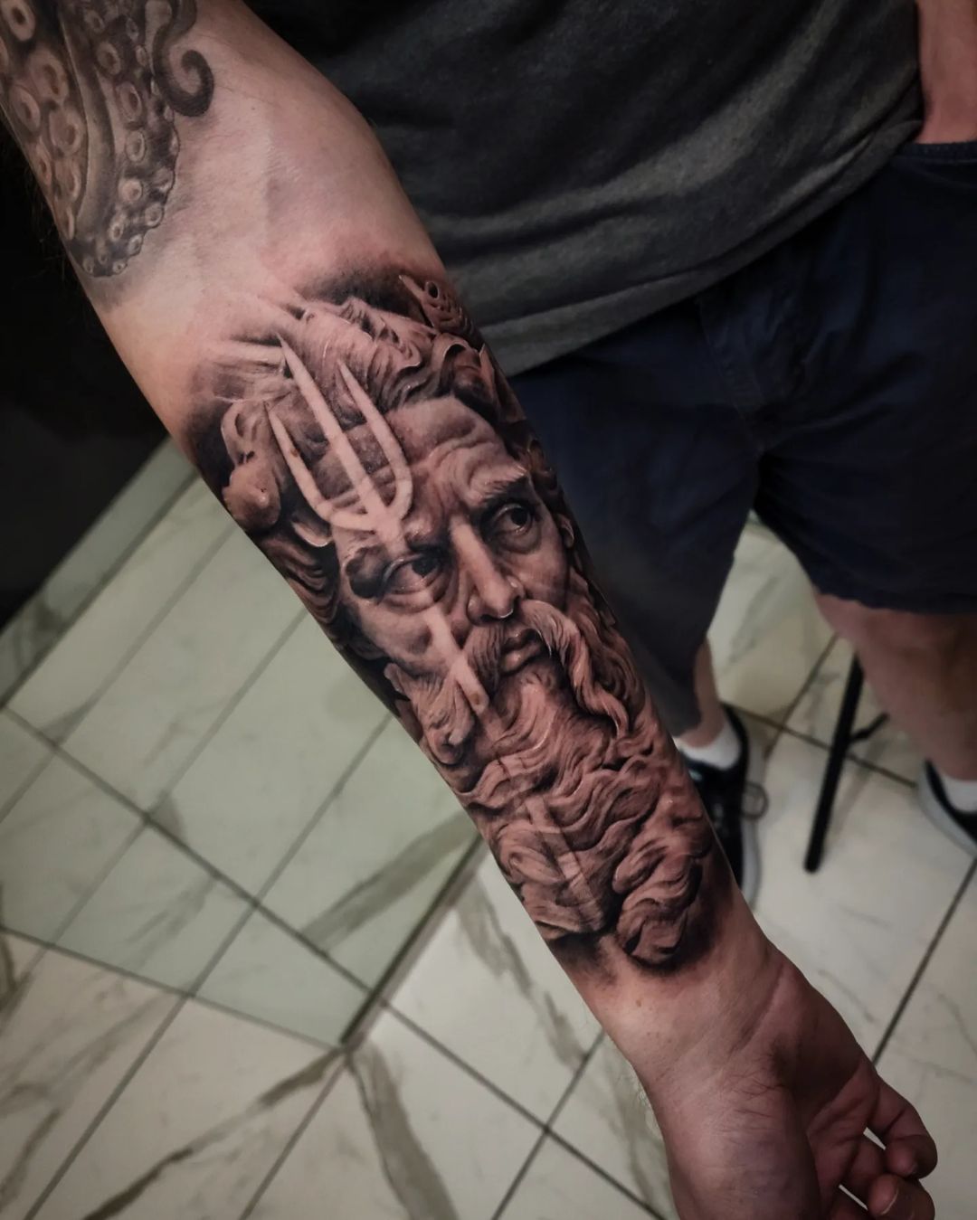 El realismo, por otro lado, se caracteriza por detalles increíblemente precisos y un aspecto fotográfico. Este estilo se utiliza a menudo para tatuajes de dioses griegos que tienen una imagen icónica, como Zeus o Atenea.