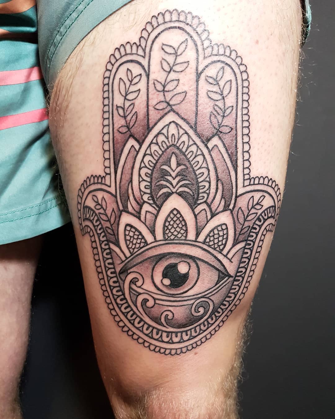 Cuando se ven tatuajes de la mano de Fátima, se observa que hay dibujos donde aparecen tres dedos extensos, y en otras, el pulgar y el meñique curvados. En cuanto al ojo que está en el interior, indica que es un amuleto de protección que esquiva la envidia, el mal y en otros casos aumenta la fertilidad.